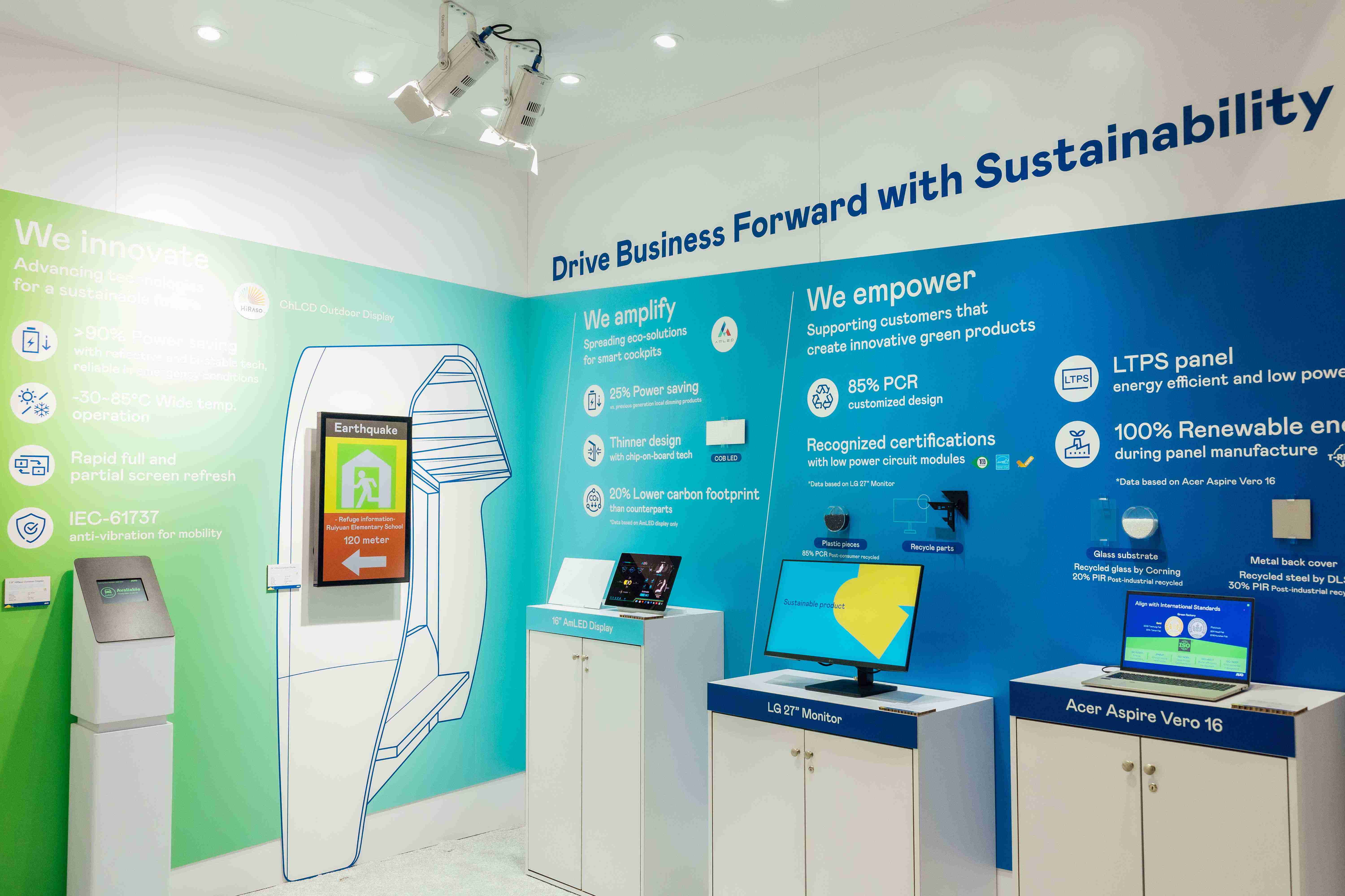 人生就是博运用创新显示技术HiRaso胆固醇液晶双稳态技术达到显示零耗能、、、、扩大节能省电的AmLED显示技术应用于车用产品、、、、以再生的消费后回收(PCR)塑料及全绿电生产之面板,,应用于笔电及萤幕,,增加绿色价值。。。