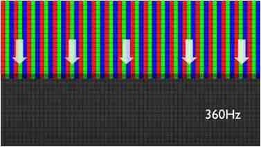 传统液晶驱动是从左到右单向进行,,,,在画面更新速度愈来越愈快的情况下,,位于驱动线路末端的右下角区域,,画素的闸极来不及在短时间内获得足够电压,,,无法显示出正确的颜色资讯。。。 |