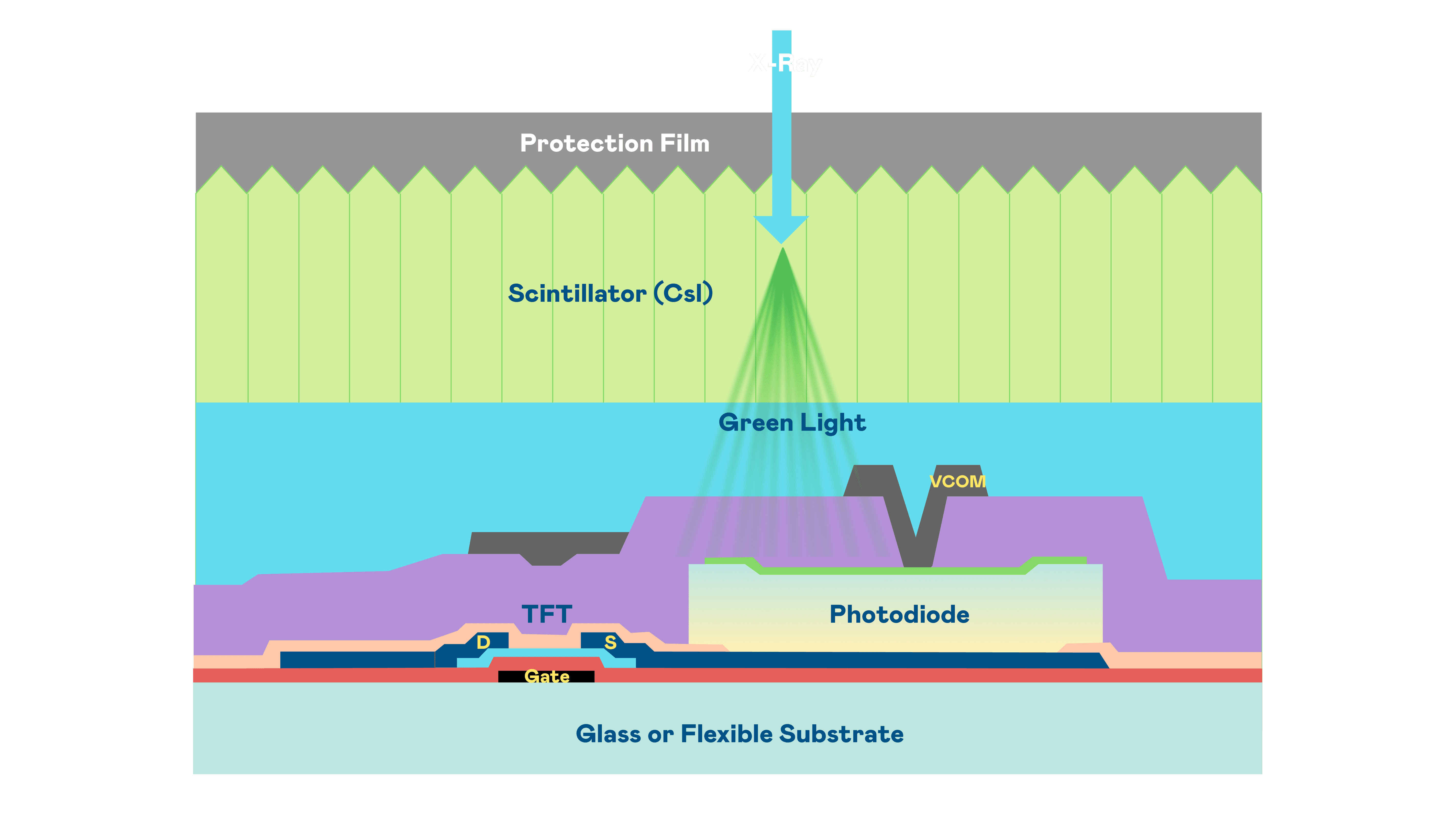 人生就是博的X光影像感测阵列使用薄膜电晶体 (TFT) 作为每个像素的读取开关,,,搭配光电二极体(Photodiode)的光电转换元件,,,用以感测X光影像讯号。。。